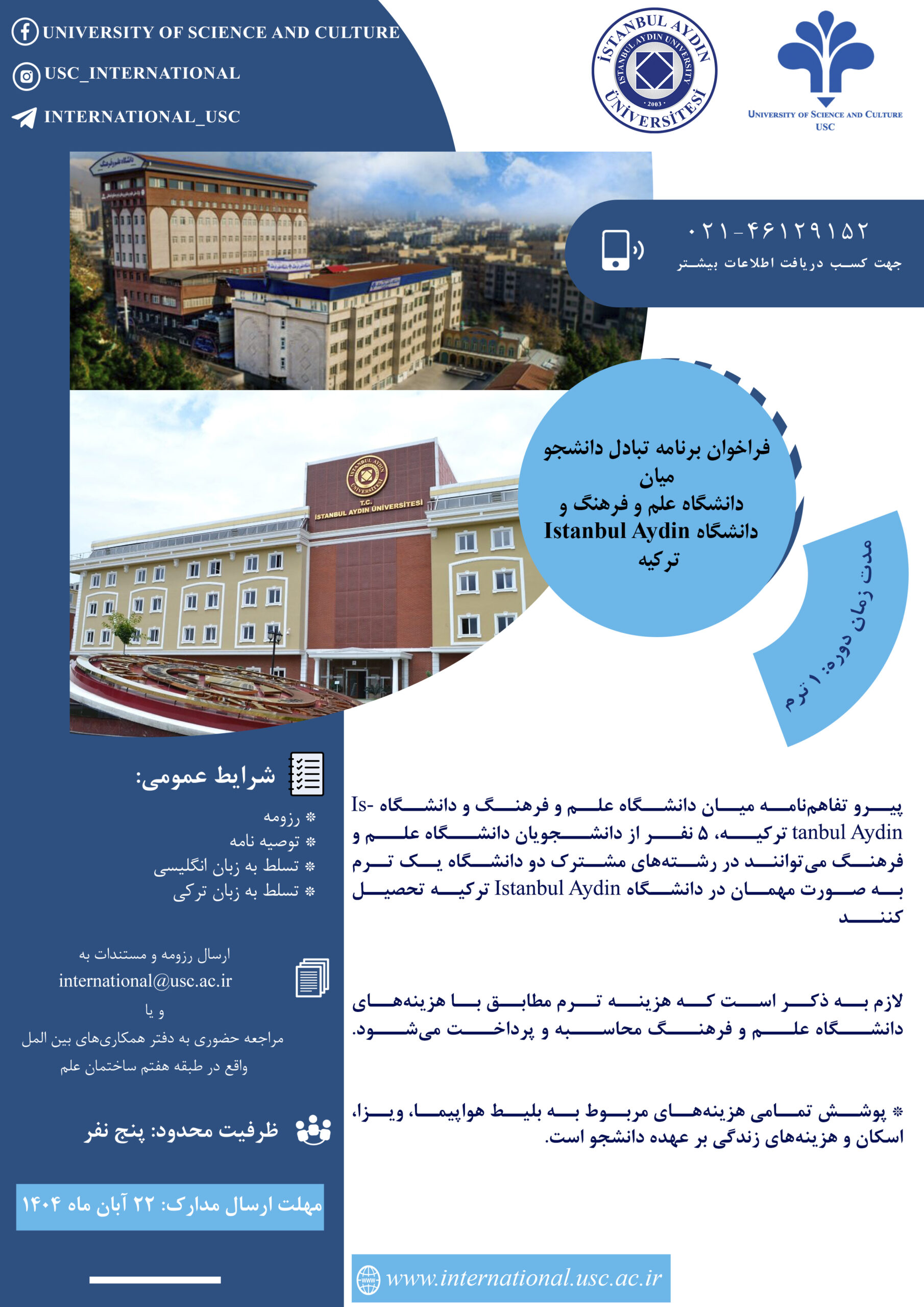 Students interested in participating in this program for the second semester of the 1404–1405 academic year are required to submit their information—including full name, curriculum vitae (CV), and level of proficiency in Turkish and English—by November 13, 2025 (22 Aban 1404). Applications should be sent with the subject line “Application for Istanbul Aydin University Exchange Program” to international@usc.ac.ir.