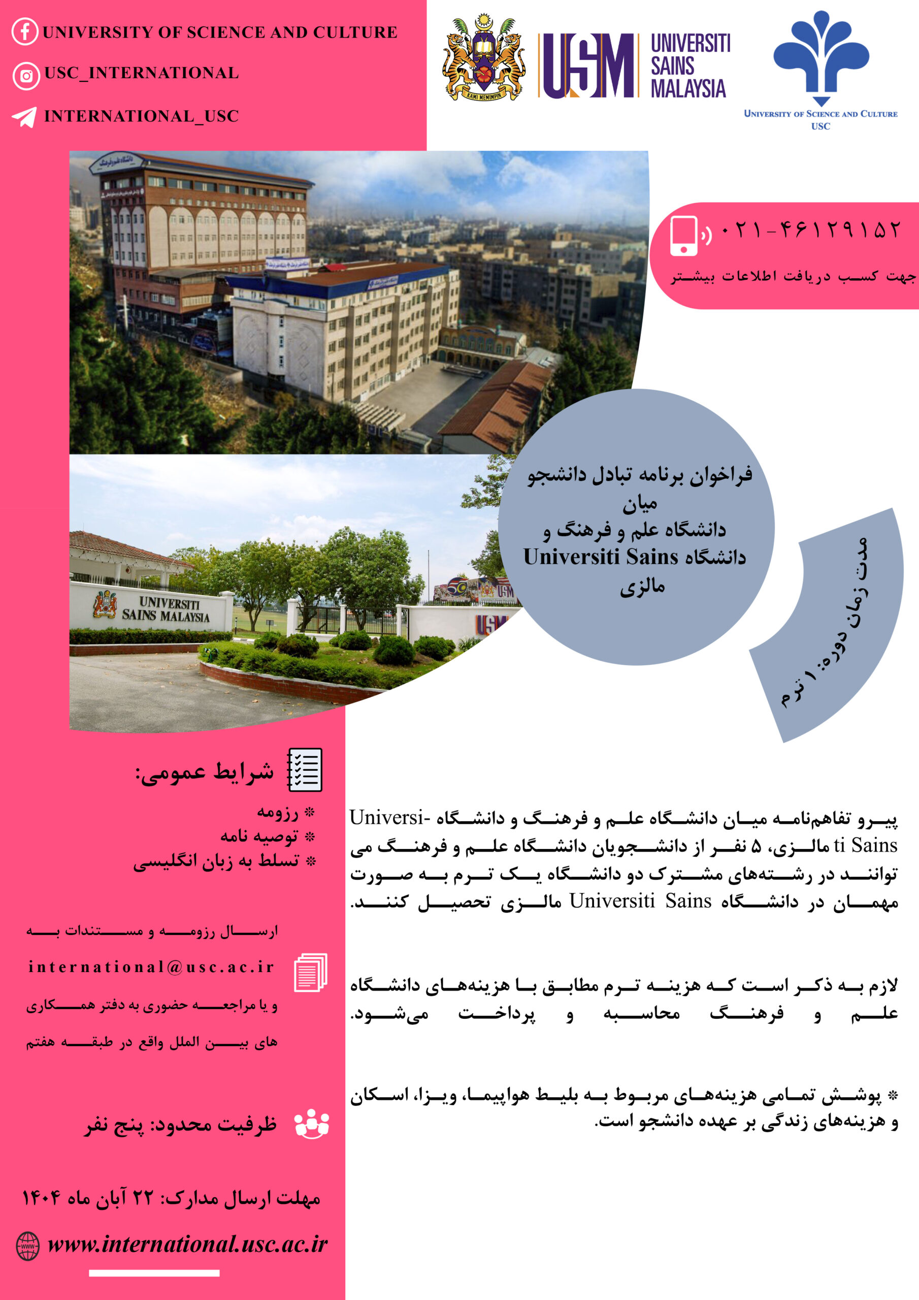Students interested in applying for this opportunity for the second semester of the 1404–1405 academic year are requested to submit their information—including full name, curriculum vitae (CV), and level of English language proficiency—by November 13, 2025 (22 Aban 1404). Applications should be sent via email with the subject line “Application for USM Malaysia Exchange Program” to international@usc.ac.ir.